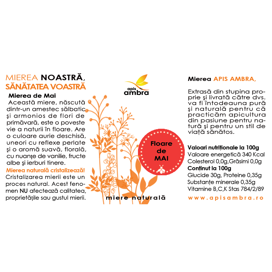 Mierea de Flori de Mai este o recoltă excepțională de primăvară timpurie, capturând energia și prospețimea naturii la începutul sezonului cald. Este un sortiment poliflor, cu o pondere majoritară din nectarul cules de albine din surse bogate și diverse, precum: Salcâm (care îi conferă o dulceață fină și o întârziere în cristalizare), Rapiță, Trifoi Alb, Cireș și Păpădie.