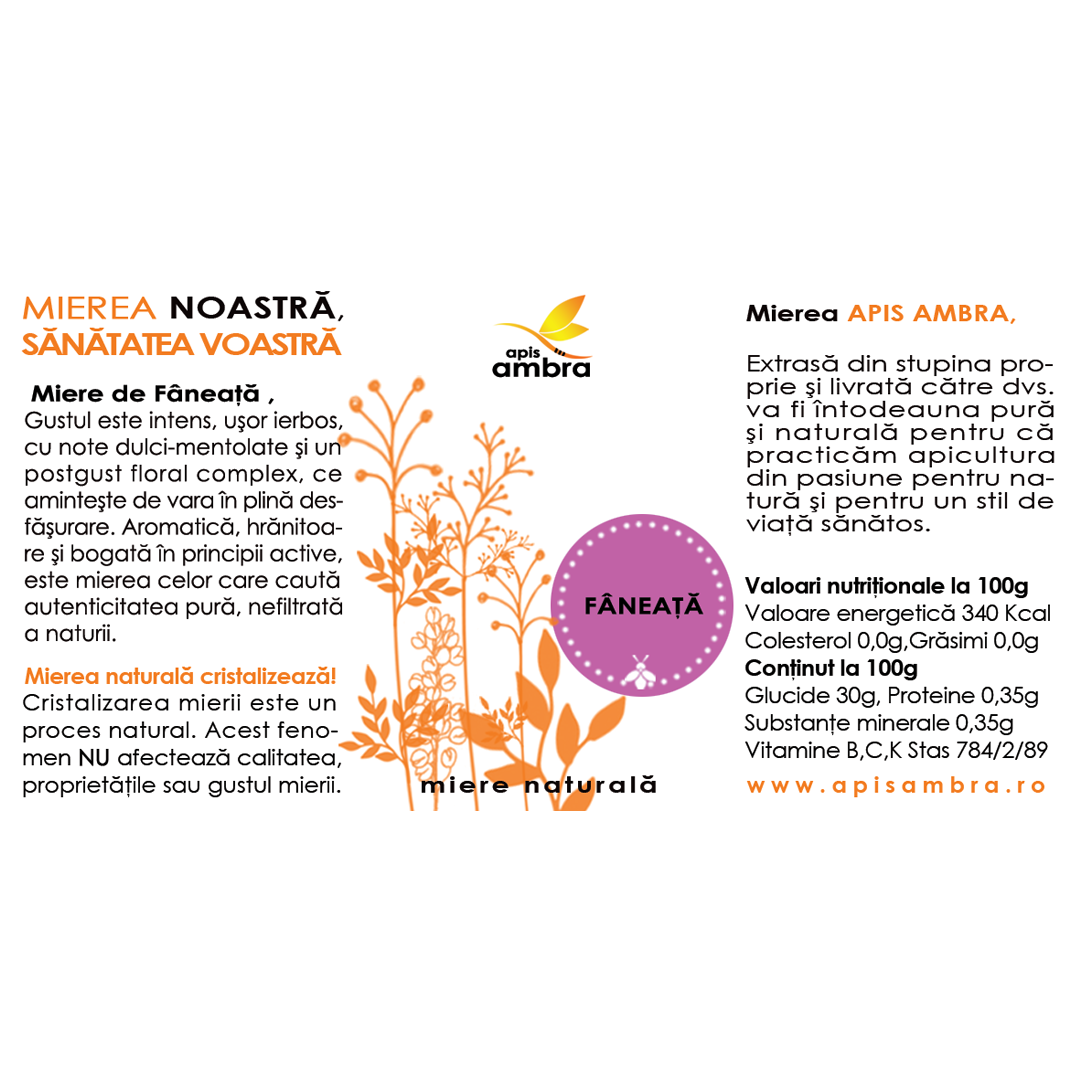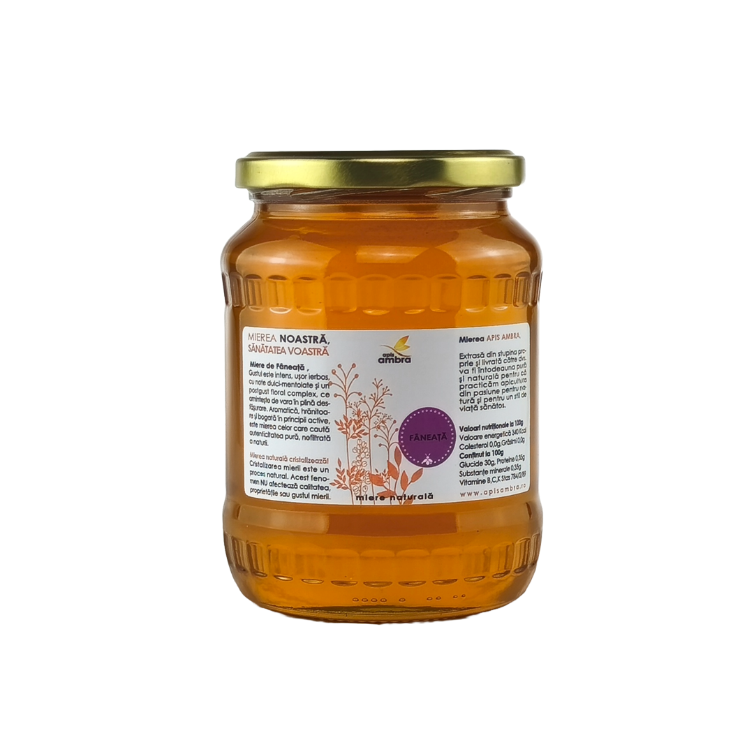 Mierea de fâneață este un amestec vibrant și aromat de nectar adunat din diverse flori de câmp, specific fânețelor bogate în vegetație. Culoarea sa variază de la un galben auriu deschis la un chihlimbar intens, în funcție de flora dominantă. Aroma sa este complexă și parfumată, cu note florale distincte, iar gustul este dulce, delicat și persistent. Datorită provenienței sale dintr-o gamă largă de flori, această miere este recunoscută pentru compoziția sa bogată în nutrienți, enzime și substanțe bioactive. Este alegerea perfectă pentru cei care caută un gust autentic, care evocă mirosul și frumusețea verii.