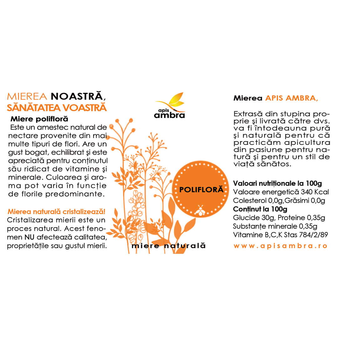 Mierea polifloră este un deliciu natural, obținut din nectarul florilor variate, oferind o gamă bogată de arome și o textură cremoasă. Cunoscută pentru calitățile sale nutritive, această miere este un ingredient versatil, ideal pentru îndulcirea băuturilor, prepararea deserturilor sau pur și simplu savurată pe o felie de pâine. Cu un gust echilibrat și dulce, mierea polifloră nu doar că încântă papilele gustative, dar aduce și numeroase beneficii pentru sănătate.