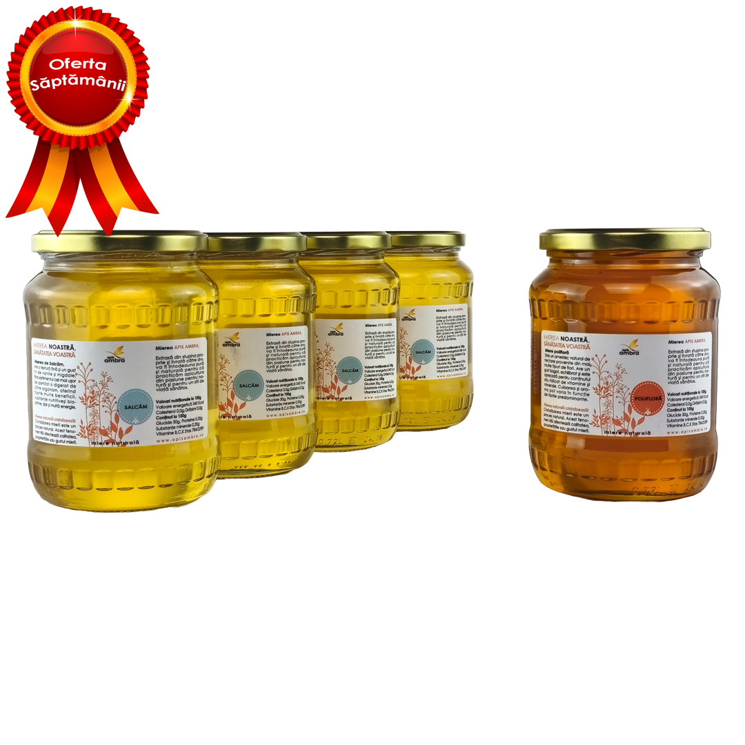 Deliciul Dulce ( 4 X miere Salcâm 950g + 1 x miere Polifloră 950g GRATIS)