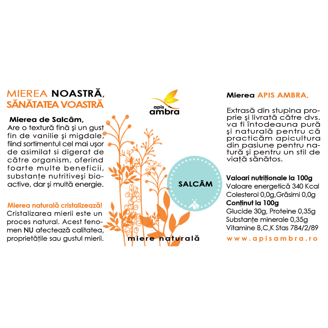 Apis Ambra este numele de brand/comercial care garantează proveniența, calitatea și trasabilitatea acestei mieri de salcâm, indicând sursa specifică a produsului.